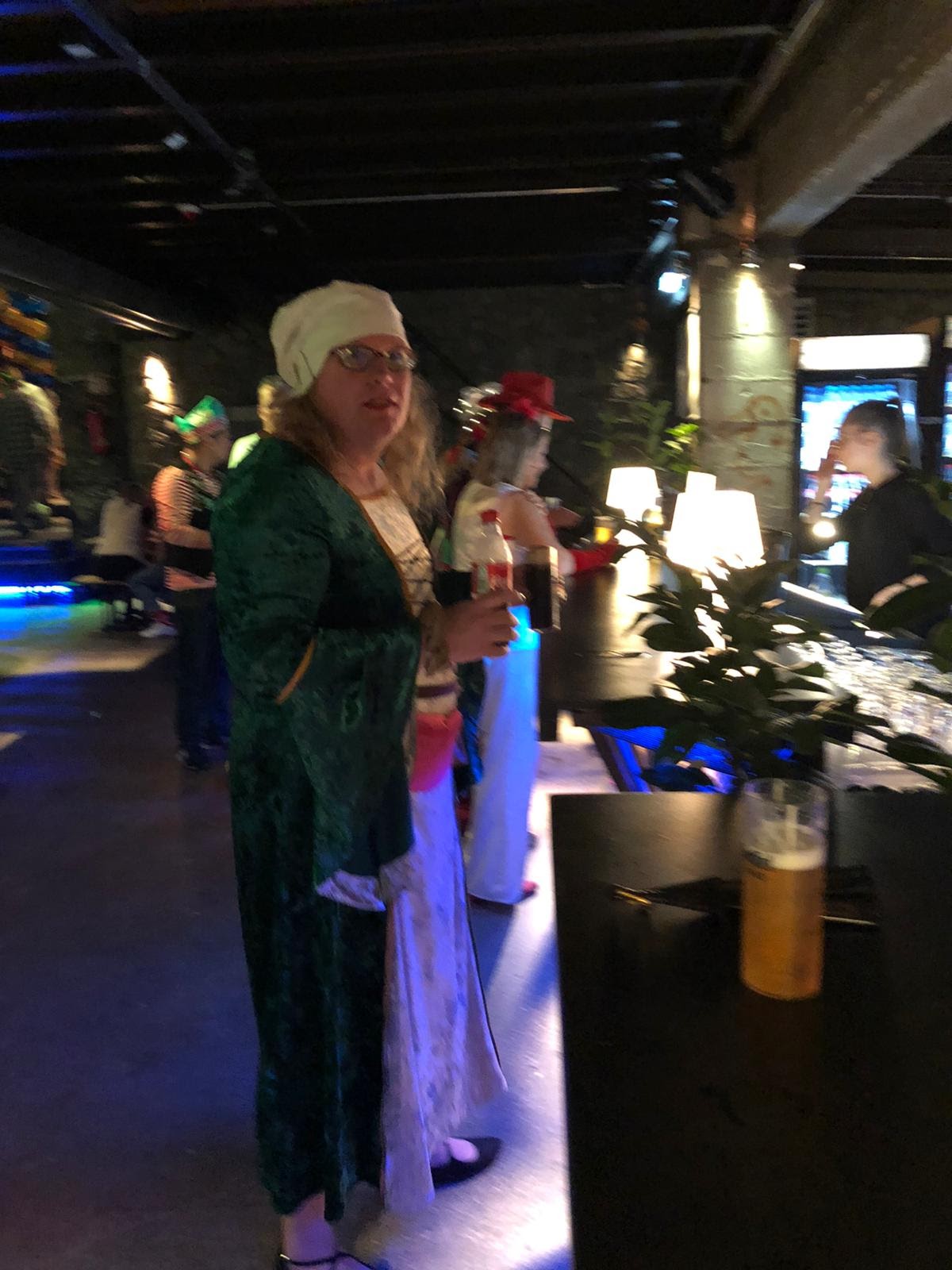 Halbschuhe getragen. Die grüne Strickstrumpfhose ist schon uralt. Die trage ich nur noch zum Karneval, weil man eine grüne Strumpfhose in dieser Ausführung nicht mehr nachkaufen kann. Dabei hatte ich noch eine Schultüte, darin waren die flüssigen hochprozentigen Getränke. So verkleidet hat der Straßenkarneval richtig viel Spaß gemacht.