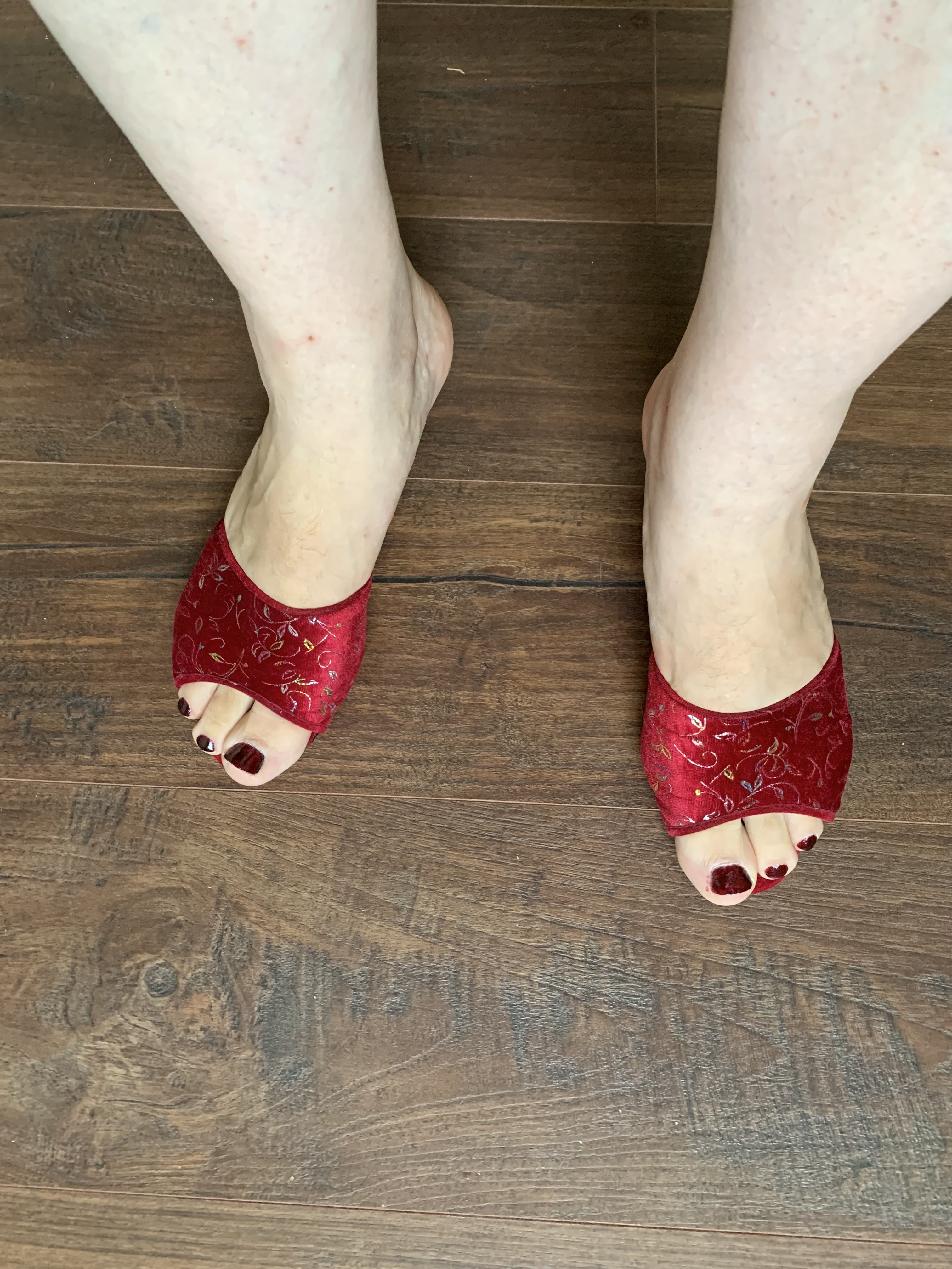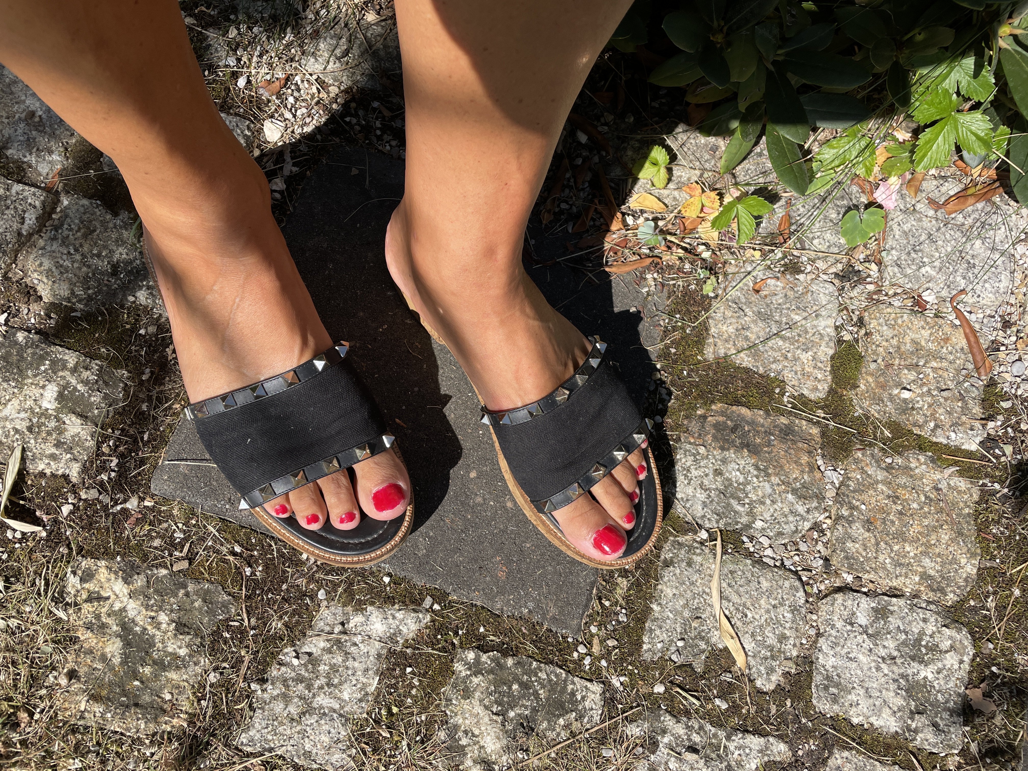 Gerade beim Tragen von Schlappen kommen meine red Noir Fussnägel gut zur Geltung