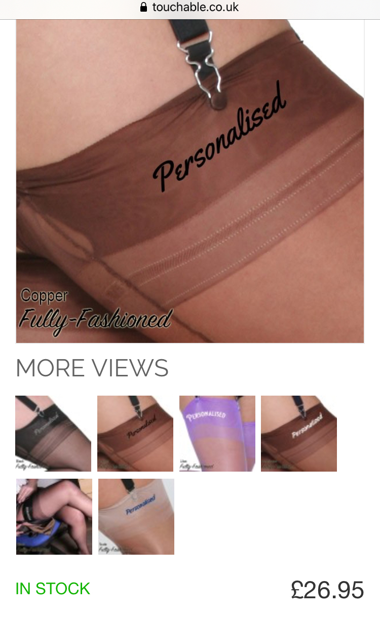 Solche personalisierten Strümpfe mag ich überhaupt nicht. Die Strümpfe sehen ja sonst ganz gut aus, sind aber doch etwas teuer. Meine Cottelli-Strümpfe mit Naht von ESDA/ROGO/ERGORA in 20 DEN kosten dagegen nur 1,75 € und sind in Größe 4 sehr lang, genau wie ich es mag. Diese Strümpfe getragen an Schlupfhüfthaltern von FORMAT (Firma Händel & Söhne) mit ganz kurzen Strumpfbändern sind für mich ideal. Kann ich nur empfehlen.