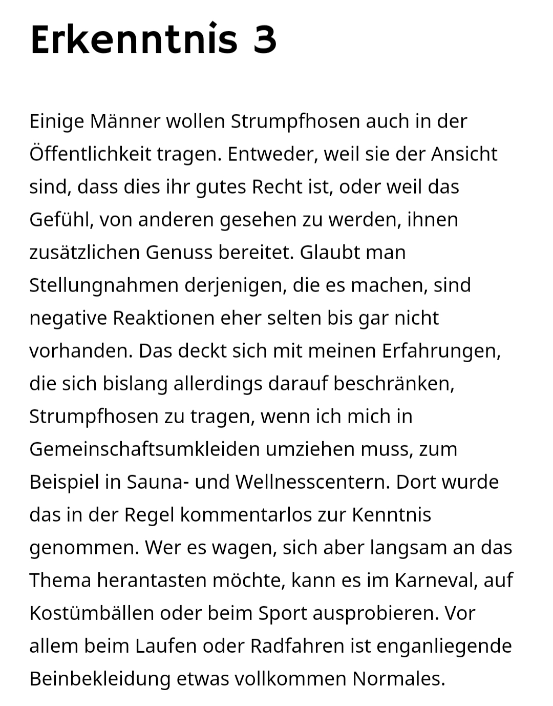 Erkenntnis 3: Einige Männer wollen Strumpfhosen auch in der Öffentlichkeit tragen. Entweder, weil sie der Ansicht sind, dass dies ihr gutes Recht ist oder weil ihnen das Gefühl, von anderen gesehen zu werden, zusätzlichen Genuss bereitet (…).