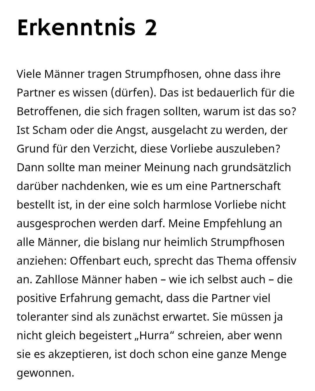 Und das Wichtigste: Strumpfhosen zu tragen, ist nichts Verbotenes oder sonstwie Anrüchiges. Also einfach mal ausprobieren und es genießen. Viel Spaß dabei.