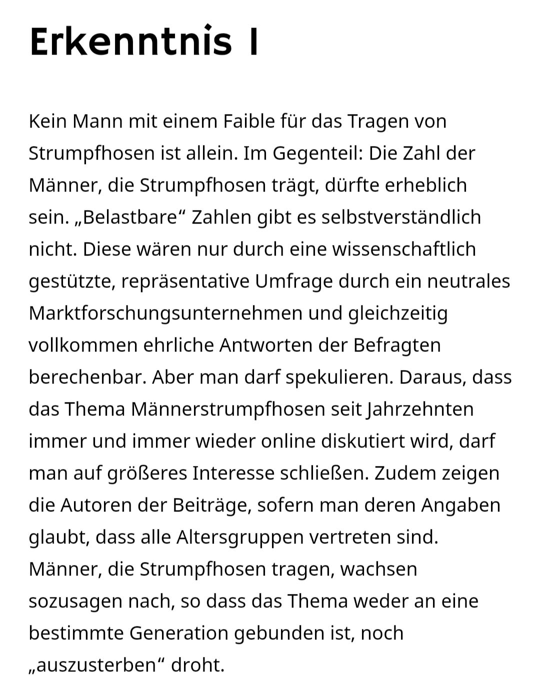 Natürlich kann es sein, dass "Männerstrumpfhosen" von männlichen Strumpfhosenträgern eher abgelehnt werden, aber Thema sind sie immer wieder. Und der foreninternen Umfrage (https://www.strumpfhose.net/xf/threads/feinstrumpfhosen-fuer-maenner-wie-steht-ihr-dazu.36175/) zufolge, würde immerhin 1/7 der Teilnehmer auf Männerstrumpfhosen umsteigen, wenn es sie gäbe, mehr als die Hälfte würde sie neben Damenstrumpfhosen auch kaufen.
