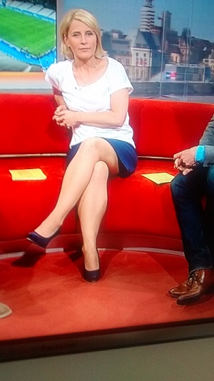 Fernsehmoderatorinnen sind ja eigentlich die einzigen Frauen, die man noch regelmäßig in Feinstrumpfhosen sieht. Besonders nett ist dann auch der Anblick, wenn sie sich selbst an die Beine fassen ;-).